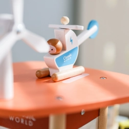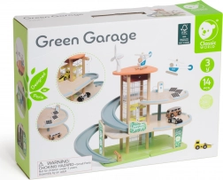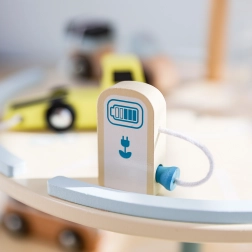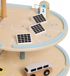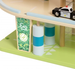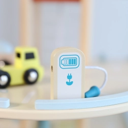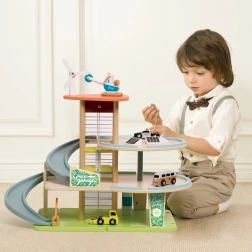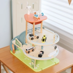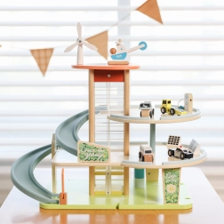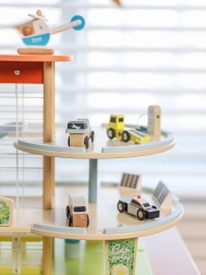 Ova drvena trospratna garaža omogućuje zahvaljujući ručno upravljanom liftu prijenos igračaka između katova. Posebna vijugava rampa omogućuje brzo spuštanje autića. Uz to, uređaj je opremljen električnom punionicom. Set uključuje tri autića i helikopter koji će pružiti sate zabave i razvijati dječju maštu.
