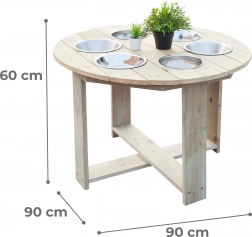 Otkrijte svijet senzorne igre s okruglim multifunkcionalnim stolom koji spaja prirodno drvo i metalne posude. Djeca mogu sigurno eksperimentirati s raznim materijalima – presipati, ulijevati, filtrirati i uspoređivati. Zahvaljujući 6 zasebnih stanica, stol je odličan za zajedničku igru i učenje kroz zabavu.