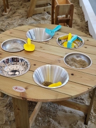 Svaka od umetnutih posuda nudi drugačiju aktivnost – od prosijavanja preko ulijevanja do miješanja i uspoređivanja materijala. Djeca kroz igru razvijaju finu motoriku i logičko razmišljanje.