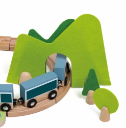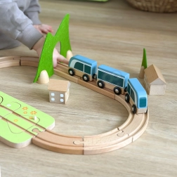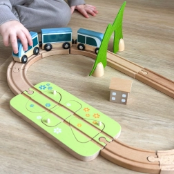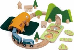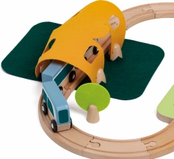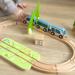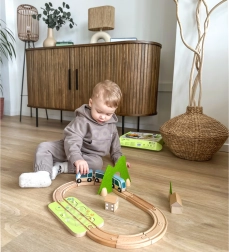Dijelovi se mogu kreativno kombinirati – drveni blokovi mogu se slagati jedan na drugi i stvarati kućice oko tračnica. Kvalitetni prirodni materijali (drvo s FSC certifikatom, filc od recikliranog P.E.T.-a) izdržljivi su, ugodni na dodir i obzirni prema prirodi. Idealno za samostalnu igru i zajedničko otkrivanje.