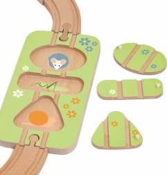 Slagalica s oblicima povezuje se s tračnicama; djeca traže odgovarajuće dijelove prema životinjama i cvijeću te vježbaju logiku i strpljenje.