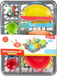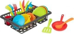 Zabavni kuhinjski set za male kuhare sadrži 27 dijelova – lonac, tavu, tanjure, šalice, pribor za jelo i druge dodatke. Potiče kreativnost, finu motoriku i socijalne vještine kroz igru kuhanja i posluživanja. Praktično pakiranje u blisteru drži sve pregledno na okupu. Pogodno za djecu od 2 godine.