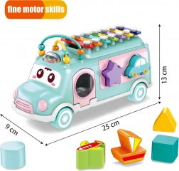 Glazbeni autić ima mnogo elemenata za manipulaciju i istraživanje. Dijete može koristiti priloženi čekić za igru na šarenom ksilofonu postavljenom na krovu vozila. Na stranama autića nalaze se otvori različitih oblika, a šarene kockice mogu se umetnuti u te otvore. Ova igra pomaže djetetu razvijati koordinacijske sposobnosti i prepoznavanje boja i oblika. Kuglice na krovu, koje dijete može pomicati, vježbaju njegovu spretnost i koncentraciju.