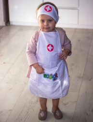 Šarmantan kostim medicinske sestre brenda Woopie oduševit će sve male ljubitelje igre uloga. Set sadrži bijelu pregaču i kapicu sa simbolom križa, idealno za djecu do cca 5 godina i visine do cca 120 cm. Potiče maštu, kreativnost i empatiju u igri doktora. Praktični džepovi primaju dječji pribor, a kapica na čičak lako se prilagođava.