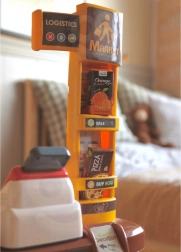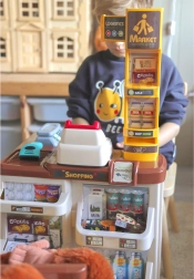 Mehanička vaga vjerno imitira pravu, a police s cjenovkama pomažu djeci razvrstavati, slagati i učiti o vrijednostima.