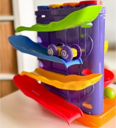Zahvaljujući tematskim kuglicama moguće je kroz igru vježbati brojanje i abecedu. Djeca će poboljšati koordinaciju, snagu stiska i razumijevanje uzroka i posljedice – kuglica ili autić kreće odozgo i spušta se do dna po valovitim stazama.
