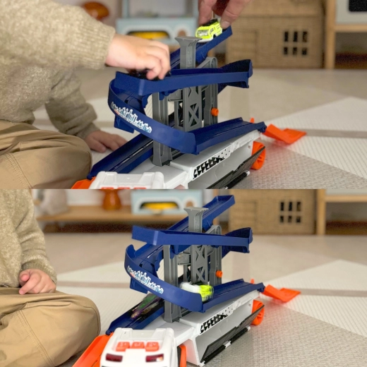 Višerazinska staza s rampom omogućuje parkiranje, brze spustove i skokove. Savršeno za razvoj motorike i natjecateljskog duha.