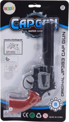 Otkrijte klasični revolver na kapisle koji će razveseliti male i velike ljubitelje vesterna. Zahvaljujući rotirajućem bubnju djeluje uvjerljivo i može se koristiti s kapislama i bez njih – kao igračka, rekvizit ili dio kostima. Crno tijelo s crvenom drškom daje autentičan izgled i udobno držanje.
