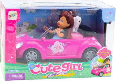 Slatka lutkica sjeda u stilski ružičasti kabriolet s otvorenom konstrukcijom koja olakšava umetanje i vađenje figurice. Zahvaljujući pokretnim rukama i nogama lako je posjesti za volan i krenuti na izlet s vjernim psićem na stražnjem sjedalu.