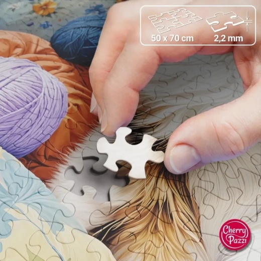 Uživajte u opuštajućem slaganju s prekrasnim motivom mačke koja se igra klupkima pređe. Ova kvalitetna slagalica s 1000 dijelova nudi precizne izreze, ugodan papir i nakon slaganja stvara sliku dimenzija cca 50 × 70 cm – idealno za uokviravanje.