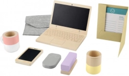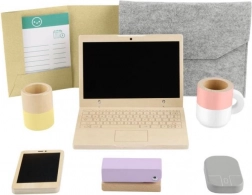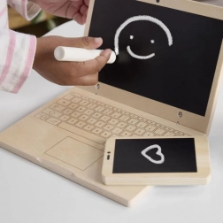 Neka djeca istražuju svijet odraslih na svoj način. Ovaj promišljeni drveni set „rad od kuće“ donosi autentične dodatke u sigurnoj i ugodnoj izvedbi. „Laptop“ i „mobitel“ s pločom za kredu pozivaju na beskrajno pisanje, crtanje i osmišljavanje priča bez trošenja papira. Kvalitetno drvo s FSC certifikatom ugodno je na dodir i odolijeva svakodnevnoj dječjoj mašti.