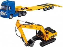 Tegljač s niskopodnom poluprikolicom i bagerom omogućuje odigravanje stvarnog prijevoza teške mehanizacije – idealno za kreativnu igru i kolekcionarske vitrine.
