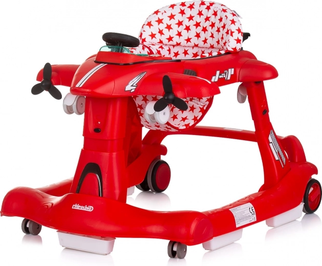 Hodalica Airplane Red spaja zabavu i sigurnost u jednom. Šareni panel s igračkama i glazbom stimulira sluh i vid, dok robusna konstrukcija i široka baza pružaju potrebnu stabilnost. Zahvaljujući pametnoj regulaciji brzine i blokadi stražnjih kotača, dijete uči hodati sigurnije i samopouzdanije.