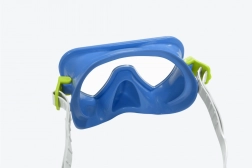 Plava ronilačka maska opremljena je lećama s UV zaštitom i podesivim silikonskim remenom koji osigurava udobnost i sigurnost pod vodom.