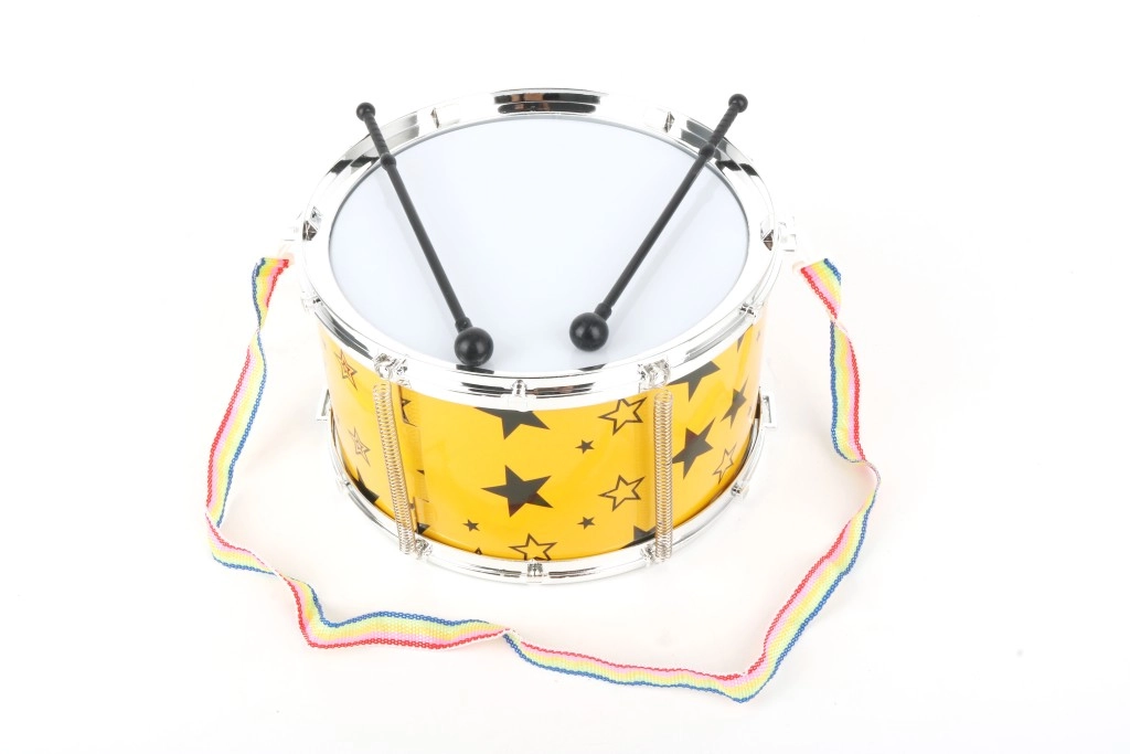 Žuti bubanj s crnim zvjezdicama i višebojnim remenom vizualno je privlačan djeci.