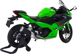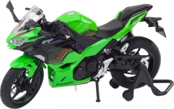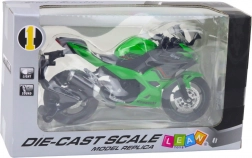 Metalni model sportskog motocikla opremljen je realističnim elementima, poput okretnih upravljača, ovjesa s oprugama i rotirajućih kotača, koji omogućuju simulaciju stvarne vožnje i manevriranja. Detalji motocikla, uključujući aerodinamičan dizajn i zelenu boju inspiriranu klasičnim trkaćim modelima, daju modelu autentičan karakter.