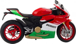 Metalni model s trobojnim dizajnom (crvena, bijela, zelena) inspiriranim talijanskim trkaćim motociklima ističe se autentičnošću.