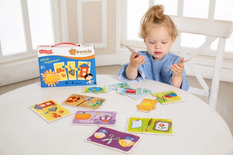 Otkrijte pametan set Far Far Land koji djecu na razigran način uči povezivanju i odnosima između predmeta. Svaka je slika podijeljena na tri dijela, a zadatak je pronaći ispravnu trojku koja pripada zajedno. Slaganje potiče koncentraciju, strpljenje i donosi radost svakog uspješno složenog motiva.