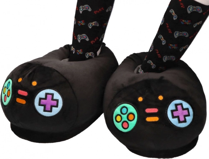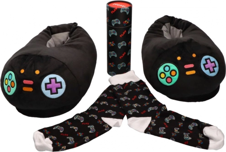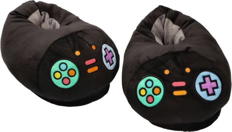 Ušuškajte stopala u udobnost s originalnim papučama Let's Play. Njihova mekana podstava i topli pliš brinu se za komfor tijekom hladnih dana, dok šarena vezenja gumba prizivaju retro gaming kontrolere. Zahvaljujući protukliznoj donjoj strani osjećat ćete se sigurno kod kuće čak i na glatkim podovima.