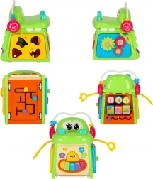 Kocka je idealna za djecu od 18 mjeseci. Zahvaljujući kotačićima lako se prenosi i pomiče, pa zabavlja i kod kuće i na putu. Šareno izvedena i bogata aktivnostima, zadržava pažnju djeteta te potiče senzornu stimulaciju i učenje kroz igru.