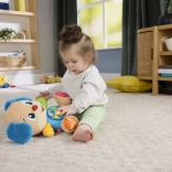 Ovaj mekani mazilac idealan je za bebe od 6 mjeseci. Djeca otkrivaju prve riječi, boje, oblike, slovka i brojanje te ujedno vježbaju finu motoriku. Psić ima na trbuščiću svjetleće srdašce i šarene tipke koje aktiviraju glazbu, zvukove i preslatke fraze.