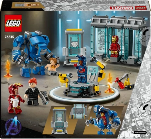 Sastavite ikoničnu oklopnicu IRON MAN-a s prozirnim plavim kapsulama u kojima se ističu tri slavna odijela. Za akciju se brine artikulirani mech Igor MK3 s kokpitom za figuricu, par robotskih ruku na servisnoj platformi i skener za dijagnostiku. Set je idealan za odigravanje scena iz filmova i za stilsko izlaganje.