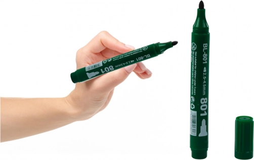 Univerzalan zeleni trajni marker s vodootpornom i brzosušećom tintom za pisanje i označavanje na metalu, staklu, plastici, papiru i kartonu. Zahvaljujući ukoso rezanom vrhu 2,5–4,5 mm izradit ćete tanke i debele linije, a uz visoku iskoristivost do 400 m bit će pouzdan pomoćnik u uredu, radionici i domu.