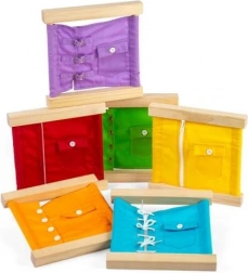Ovaj edukativni set u živim bojama inspiriran je Montessori metodom i potiče djecu na samostalnost. Na zabavan način uvježbava koordinaciju oko–ruka, jača strpljenje, koncentraciju i vještine rješavanja problema. Svaki okvir simulira stvarne situacije pri oblačenju.