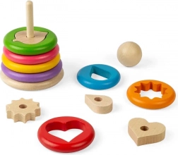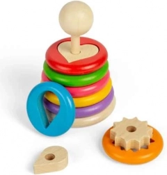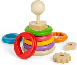 Ova originalna slagalica donosi sedam drvenih prstenova, od kojih svaki skriva drugačiji oblik – primjerice srce, zvijezdu, list ili zupčanik. Djeca najprije uparuju pravi oblik s prstenom, a potom cijeli dio navlače na drveni štap. Zabavan način za razumijevanje oblika, veličina i prostornog opažanja.