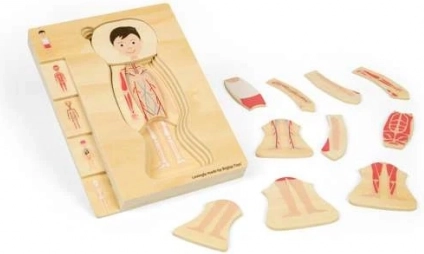 Ove edukativne puzzle prikazuju anatomiju dječaka u nekoliko slojeva – od kostura, preko mišića do organa. Djeca interaktivno usvajaju osnove ljudske anatomije te istodobno vježbaju strpljivost i prostornu maštu.