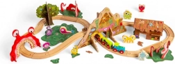 Kompletan set s lokomotivom, 2 vagona, mostom, tunelom i zabavnim čudovištima nudi sate kreativne igre i slaganja.