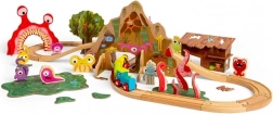- Lokomotiva, 2 vagona, tračnice, most, tunel, figurice čudovišta, stablo sa životinjicama, močvara, koliba i pribor