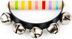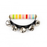 Veseli zvončići s drvenom drškom donose bebama od rođenja prve glazbene doživljaje. Pet metalnih zvonaca na elastičnoj traci stvara nježne ritmičke zvukove koji potiču slušno opažanje, koordinaciju i finu motoriku. Ergonomska, glatka drška lako se drži i malim rukicama, a šaren prugasti dizajn potiče vizualnu pažnju. Igračka je izrađena od kvalitetnih, odgovorno dobivenih materijala i ispunjava europske sigurnosne norme.