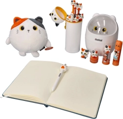 Bijelo tijelo s crnim i narančastim uškama te veselim mačjim licem privlači pažnju na prvi pogled i školskom priboru daje osebujan stil.