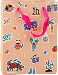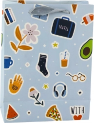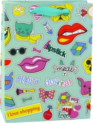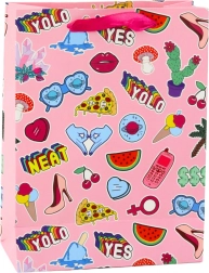 Poklon vrećica s motivom naljepnica kombinira različite grafičke elemente, poput srca, usana, voća i natpisa, što joj daje mladenački i originalan izgled. Izrađena od čvrstog ukrasnog kartona, osigurava sigurno nošenje i težih poklona.