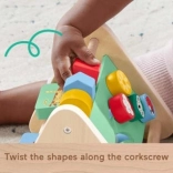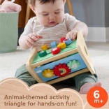 Djecu će oduševiti raznolike aktivnosti koje nudi drveni aktivni trokut Fisher-Price. Ovaj robustan i edukativan trokut izrađen je uglavnom od drva i sadrži neke plastične elemente. Sadrži obostrani panel s životinjama i interaktivnim elementima kao što su klizni dugmići, rotirajući zupčanici i tri oblika koja se okreću oko spiralne šipke trokuta.