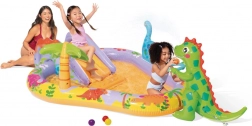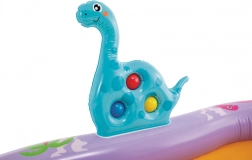 Interaktivni elementi, poput dinosaura s obručem/košem za ubacivanje i ploče s otvorima za ubacivanje loptica, razvijaju spretnost, preciznost i koordinaciju oko–ruka. Izdržljiv PVC i mekani nafukavajući dijelovi povećavaju sigurnost pri igri, a priložena zakrpa olakšava brzu sanaciju manjih oštećenja.