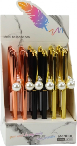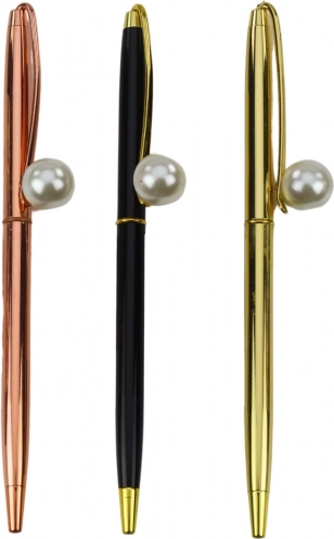Ova stilska kemijska olovka ističe se bezvremenskim dizajnom koji spaja metalno tijelo i upečatljiv biserni završetak. Dostupna je u popularnim bojama tijela – zlatnoj, crnoj i ružičastozlatnoj – te postaje elegantan dodatak za svakodnevno pisanje i posebne prigode.