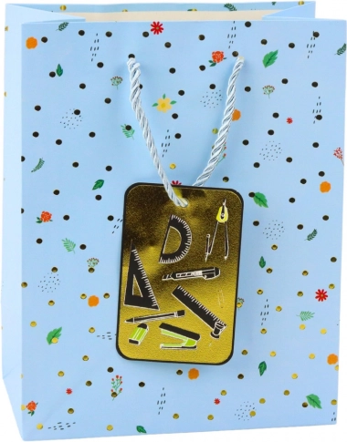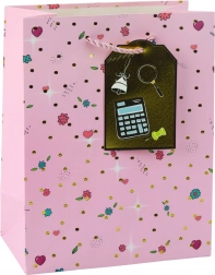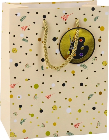 Ova poklon-vrećica spaja elegantan dizajn i praktičnu izdržljivost. Nježne točkice, cvjetni i lisnati uzorci upotpunjeni su sjajnim zlatnim detaljima i priloženom etiketom s motivima knjiga, kalkulatora ili slikarske palete. Zahvaljujući dimenzijama 32 × 26 × 12 cm, udobno prima male do srednje velike poklone.