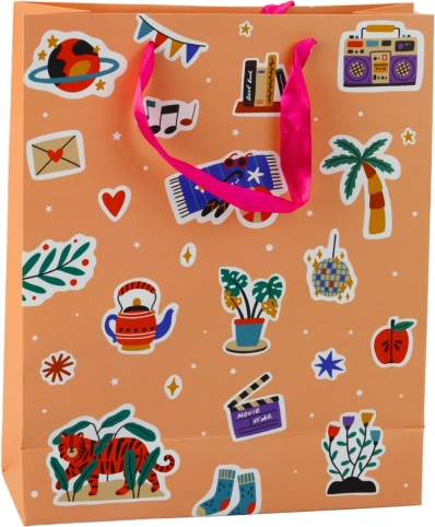 Originalna poklon-vrećica s tiskom raznobojnih naljepnica i modnih natpisa privlači pažnju na prvi pogled. Živopisne boje i trendi dizajn čine je odličnim dodatkom poklonima za mlade i odrasle. Zahvaljujući dimenzijama 32 × 26 × 12 cm bez problema prima manje i srednje velike poklone.
