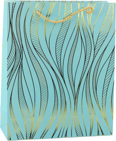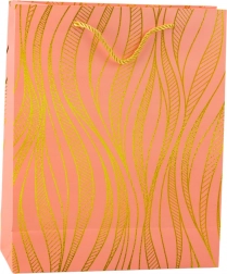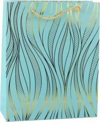 Ova stilska poklon-vrećica ističe se elegantnim zlatnim motivom valova na obojenoj podlozi i čvrstom konstrukcijom koja pouzdano nosi i teža iznenađenja. Usklađene ručke od špage omogućuju udobno i sigurno prenošenje.