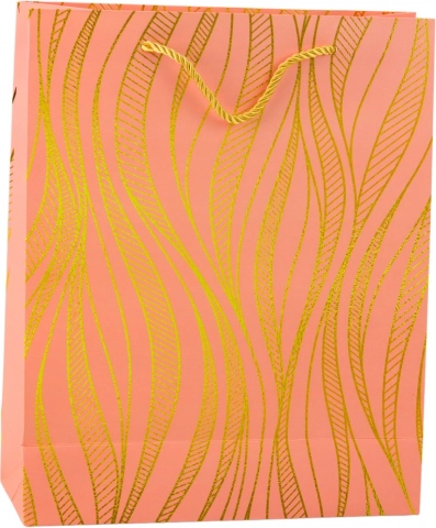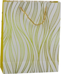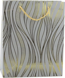 Elegantna poklon-vrećica s modernim dizajnom i luksuznim zlatnim valovitim uzorkom idealna je za rođendane, vjenčanja i jubileje. Izrađena je od kvalitetnog ukrasnog kartona, ima čvrste ručke od špage i zahvaljujući dimenzijama 32 × 26 × 12 cm udobno prima srednje velike i veće poklone.