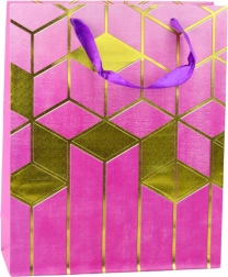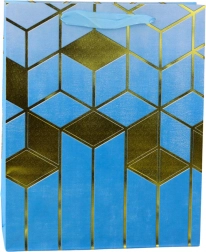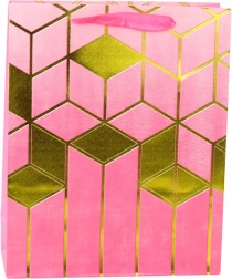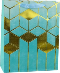 Stilna poklon-vrećica od čvrstog ukrasnog kartona s geometrijskim zlatnim uzorkom u modernim bojama. Izdržljiva, elegantna i idealna za veće poklone za rođendane, vjenčanja ili druge svečane prigode.