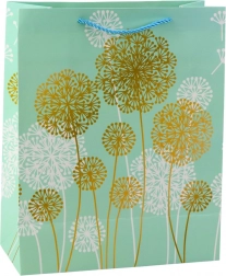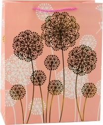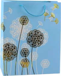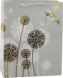 Ova stilska papirnata vrećica s nježnim prirodnim uzorkom maslačaka i zlatnim te bijelim akcentima vašem poklonu daje dozu luksuza. Prikladna je za rođendane, obljetnice, vjenčanja i obiteljska slavlja te se savršeno uklapa u moderne dekorativne trendove.