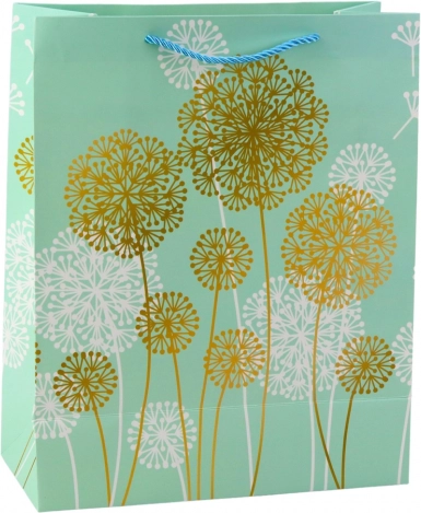 Elegantna poklon-vrećica s motivom maslačaka i zlatnim detaljima odličan je izbor za svaku prigodu. Izrađena od kvalitetnog dekorativnog kartona s čvrstim špagastim ručkama za udobno nošenje. Univerzalna dimenzija 32 × 26 × 12 cm prima manje i veće poklone te osigurava stilno i reprezentativno pakiranje.