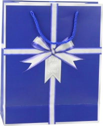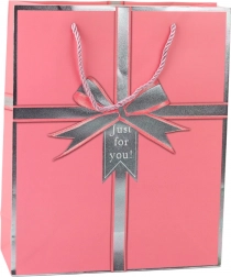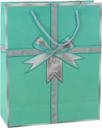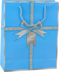 Elegantna poklon-vrećica s motivom srebrne mašne i natpisom "Just for you!" daje svakom poklonu stilski izgled. Izrađena je od kvalitetnog ukrasnog kartona, ima čvrste ručke od uzice i univerzalne dimenzije 32 × 26 × 12 cm za manje i srednje velike poklone. Dostupna u 4 elegantne boje – plava, zelena, ružičasta i svijetloplava.