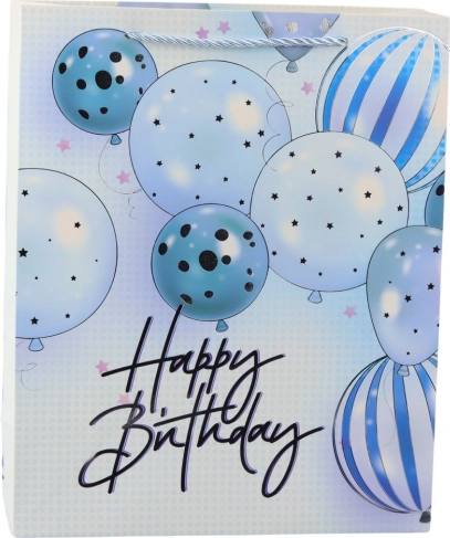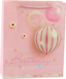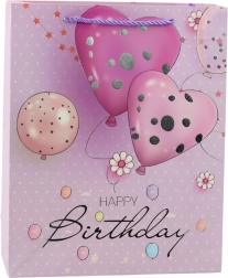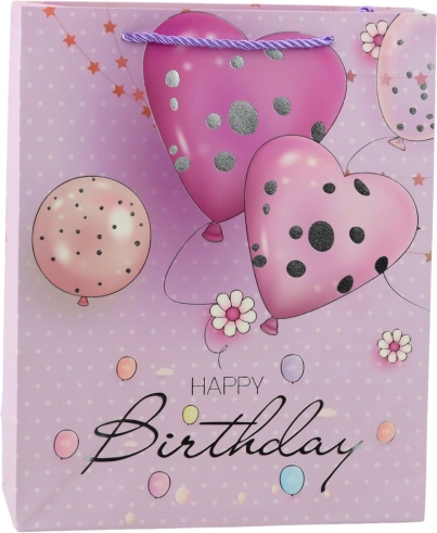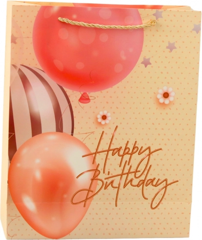 Poklon-vrećica s veselim motivom balona i elegantnim natpisom Happy Birthday odličan je izbor za svaki rođendan. Kombinira atraktivan dizajn u ružičastoj, plavoj, ljubičastoj i boji breskve s praktičnom izradom koja sigurno nosi i teže poklone.