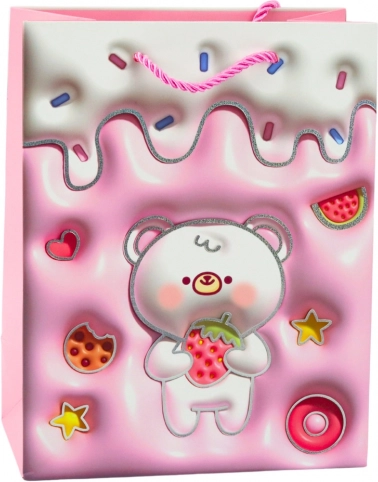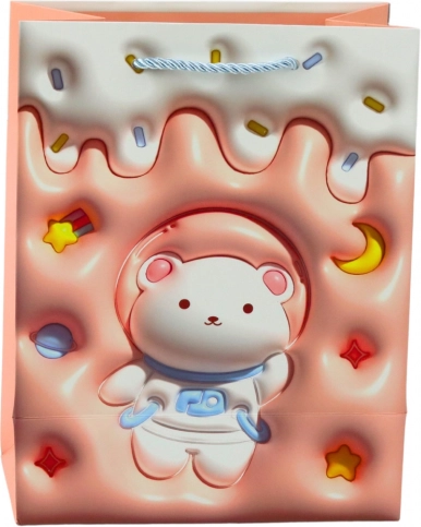 Ova poklon-vrećica od ukrasnog kartona očarava pastelnom paletom ružičaste, plave, narančaste i ljubičaste. Presladak medvjedić sa zvjezdicama i voćnim detaljima stvara 3D dojam, kao da izlazi iz vrećice. Stil upotpunjuju koloristički usklađene špagaste ručke za udobno i sigurno nošenje.