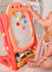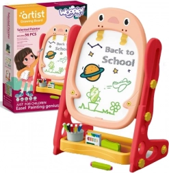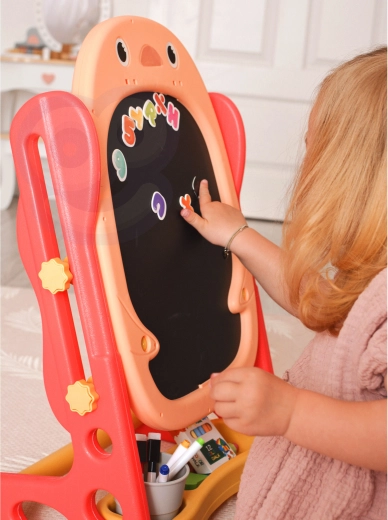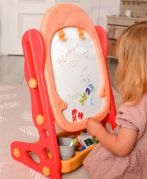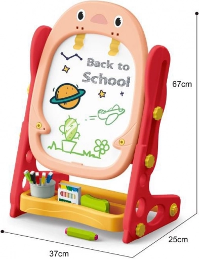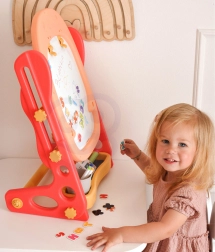 Obostrana ploča WOOPIE potiče kreativnost, finu motoriku i učenje slova i brojeva na zabavan način. Jedna strana služi kao bijela magnetska ploča za suho brisanje, druga kao kredna površina. Zahvaljujući podešavanju visine lako je prilagodite rastu djeteta.