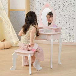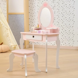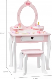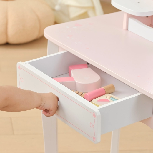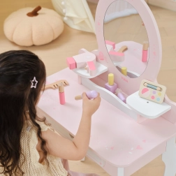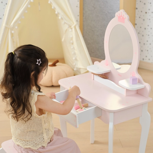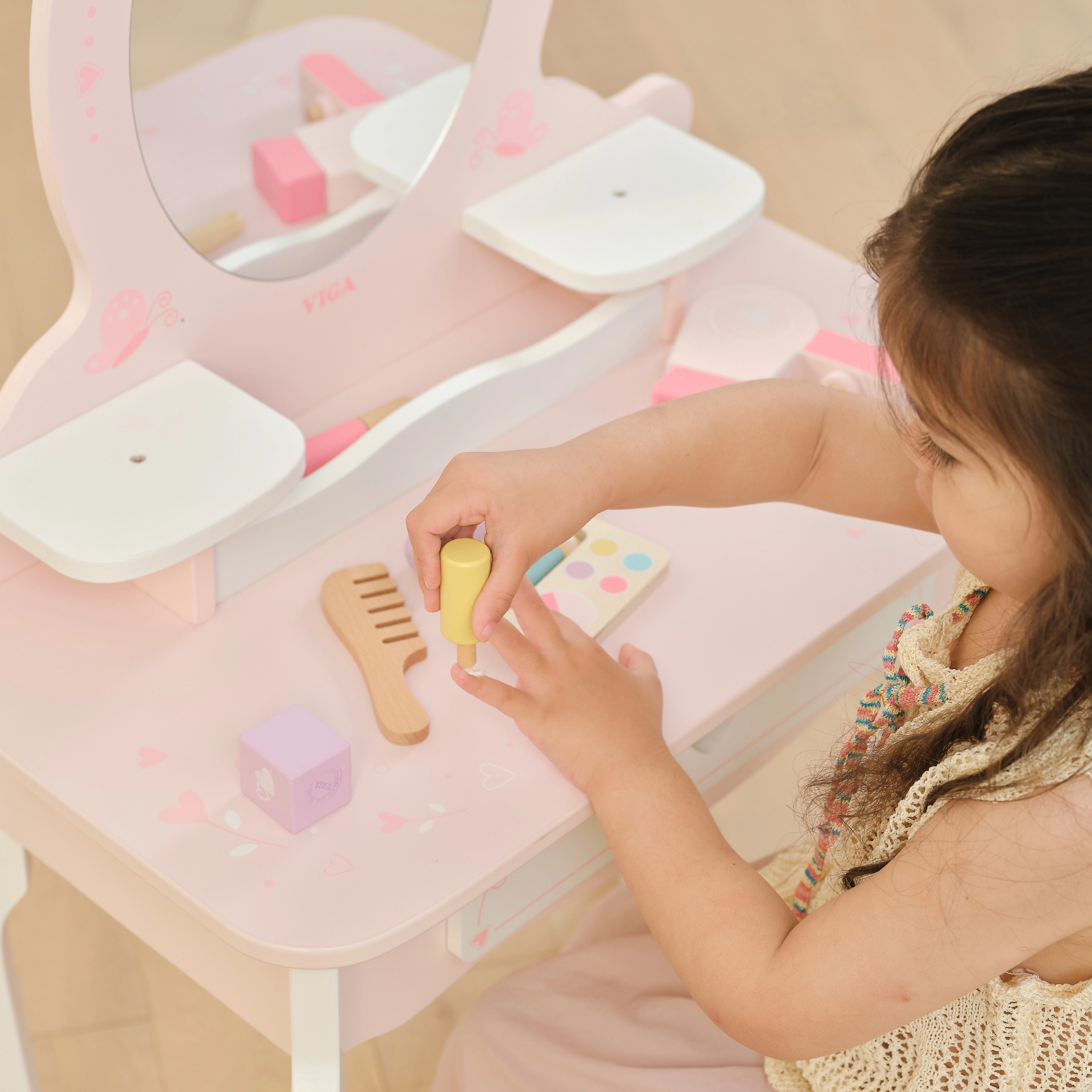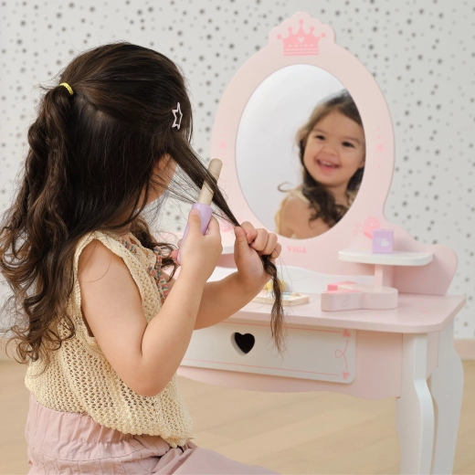 Očaravajuća drvena dječja toaletna stolić u ružičasto-bijeloj boji brenda Viga pretvara sobu u malo kraljevstvo. Ima sigurno ogledalo s krunom, udobnu stolicu, prostranu ladicu i set drvenih kozmetičkih dodataka. Zahvaljujući kvalitetnoj izradi, glatkim rubovima i netoksičnim bojama idealna je za kreativne i igre uloga djece.